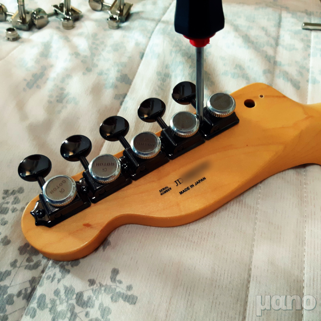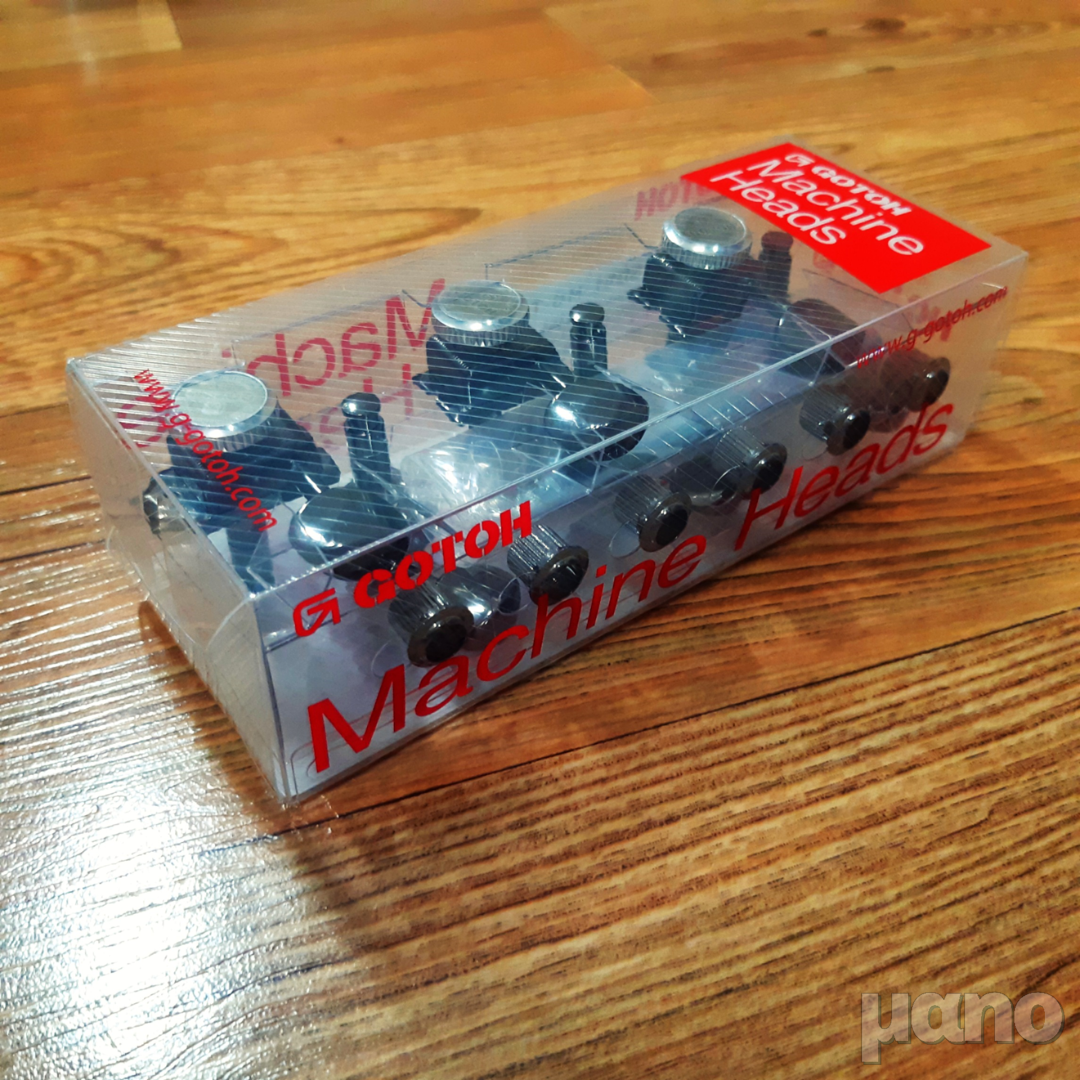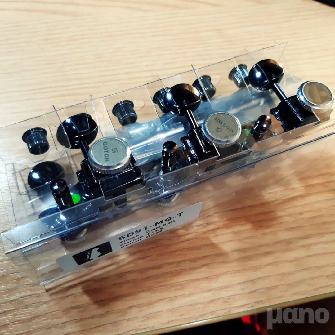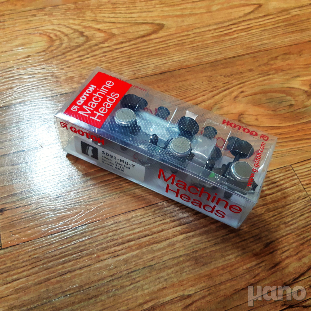 일단 저 펜더 빈티지 헤드머신에 호환되는 부품 자체가 잘 없습니다. 그렇다고 아예 빈티지로 교체하기에는 다운 그레이드인데 그렇게 하고 싶지는 않았고, 모던한 헤드머신으로 교체하자니 헤드를 재가공해야 하는데 홀 넓히고 나사 구멍 메꾸고 새로 뚫고... 하고 싶지가 않았습니다. 그래서 찾은 것이 Gotoh SD91-MG-T 헤드머신입니다. 빈티지 헤드머신 규격과 똑같은데 (SD90은 깁슨형 3:3, SD91은 펜더형 6 in line 구조입니다) 쉘러나 스퍼젤 락킹 헤드머신처럼 뒤에 버튼이 달려있어 락킹을 할 수 있는 구조로 되어 있습니다.