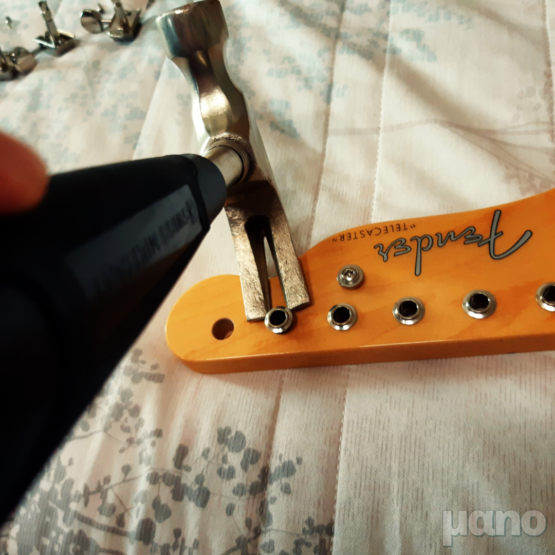 그래서 부싱을 장착해야하는데... 이 상태로 망치질했다가는 부싱도 망가지고 기타도 박살날 것 같아서 순간 멈칫...
