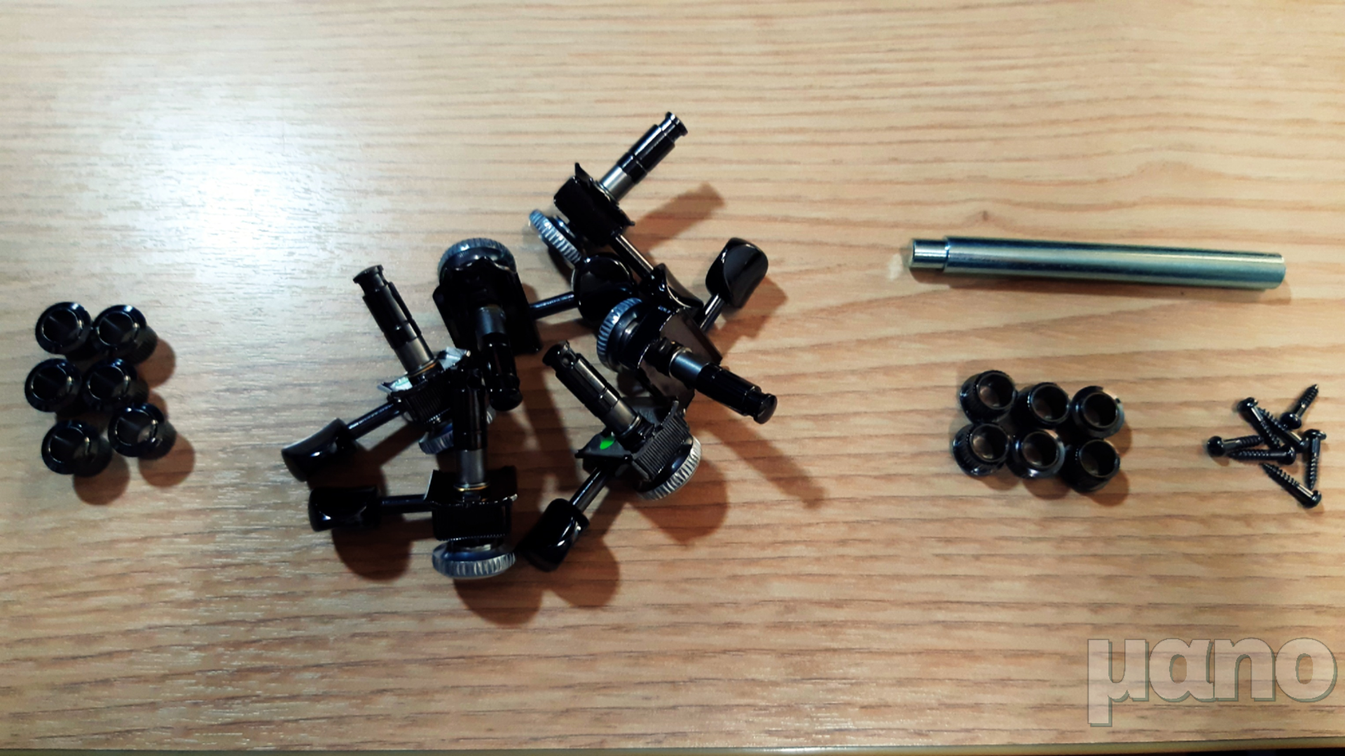잘 보면 오른쪽 헤드머신에는 연두색 스티커가 붙어있습니다. 그리고 스티커가 붙어 있는 쪽이 길이가 살짝 짧습니다. 짧은 거 3개가 1, 2, 3번 줄 용이고, 긴 거 3개가 4, 5, 6번 줄 용입니다.