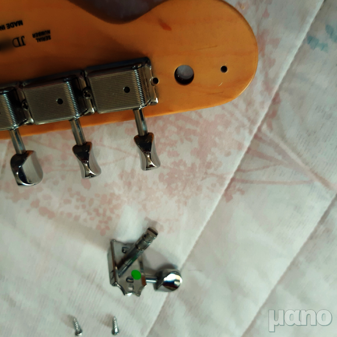 일단 저 펜더 빈티지 헤드머신에 호환되는 부품 자체가 잘 없습니다. 그렇다고 아예 빈티지로 교체하기에는 다운 그레이드인데 그렇게 하고 싶지는 않았고, 모던한 헤드머신으로 교체하자니 헤드를 재가공해야 하는데 홀 넓히고 나사 구멍 메꾸고 새로 뚫고... 하고 싶지가 않았습니다. 그래서 찾은 것이 Gotoh SD91-MG-T 헤드머신입니다. 빈티지 헤드머신 규격과 똑같은데 (SD90은 깁슨형 3:3, SD91은 펜더형 6 in line 구조입니다) 쉘러나 스퍼젤 락킹 헤드머신처럼 뒤에 버튼이 달려있어 락킹을 할 수 있는 구조로 되어 있습니다.