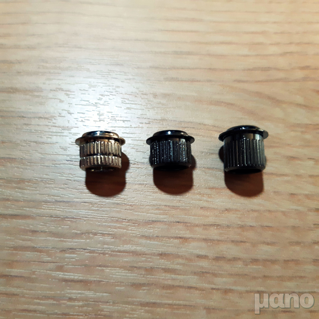이 빈티지 락킹 헤드머신(빈티지 + 락킹이라니 따뜻한 + 아이스 아메리카노도 아니고)은, 위에서 보이는 일자 나사 홈 같은 곳에 동전 같은 것을 끼워서 락킹을 조이거나 푸는 구조로 되어 있습니다. PRS 락킹 헤드머신처럼 나사 같은 구조물이 스트링 구멍을 막는 구조가 아니고 그냥 통짜 구조라 스트링을 교체할 때 줄이 꼬이지 않도록 곡예를 해야 합니다. 게다가 저거 맨손으로는 조절이 아주 어렵습니다. 일자 드라이버나 하다못해 동전이라도 있어야 스트링 교체를 할 수 있습니다.