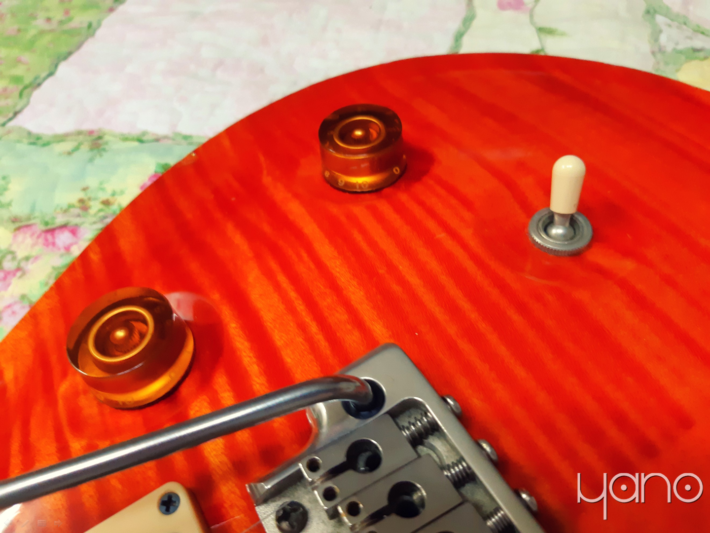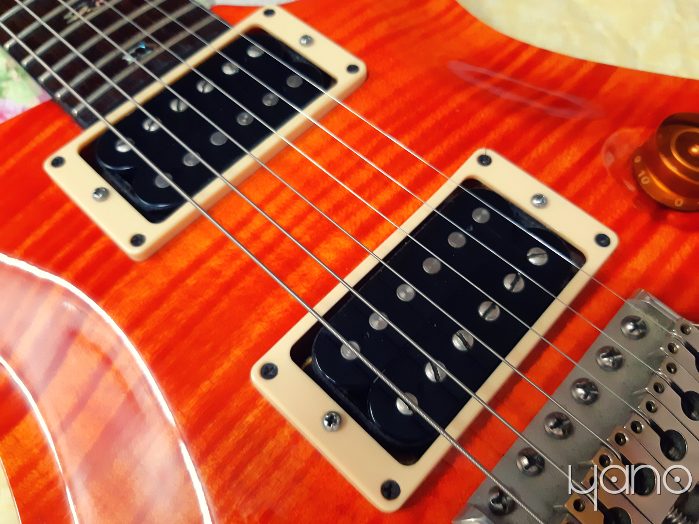 어쩐지 더 복잡해진 것 같기도 하지만, 다른 이야기로 넘어가 보겠습니다. '기타' 하면 빠지지 않는 목재 이야기입니다. 다른 옵션 없는 코어 라인 PRS 기타들처럼 이 '주황이'도 마호가니 바디, 마호가니 넥, 로즈우드 지판, 메이플 탑으로 구성되어 있습니다. 1950년대 레스폴에서부터 사용된 전통적인 조합입니다. 비록 온두라스 마호가니와 브라질리언 로즈우드가 일찌감치 벌목이 금지되어 아프리칸 마호가니와 인디언 로즈우드가 사용되고 있기는 합니다만.