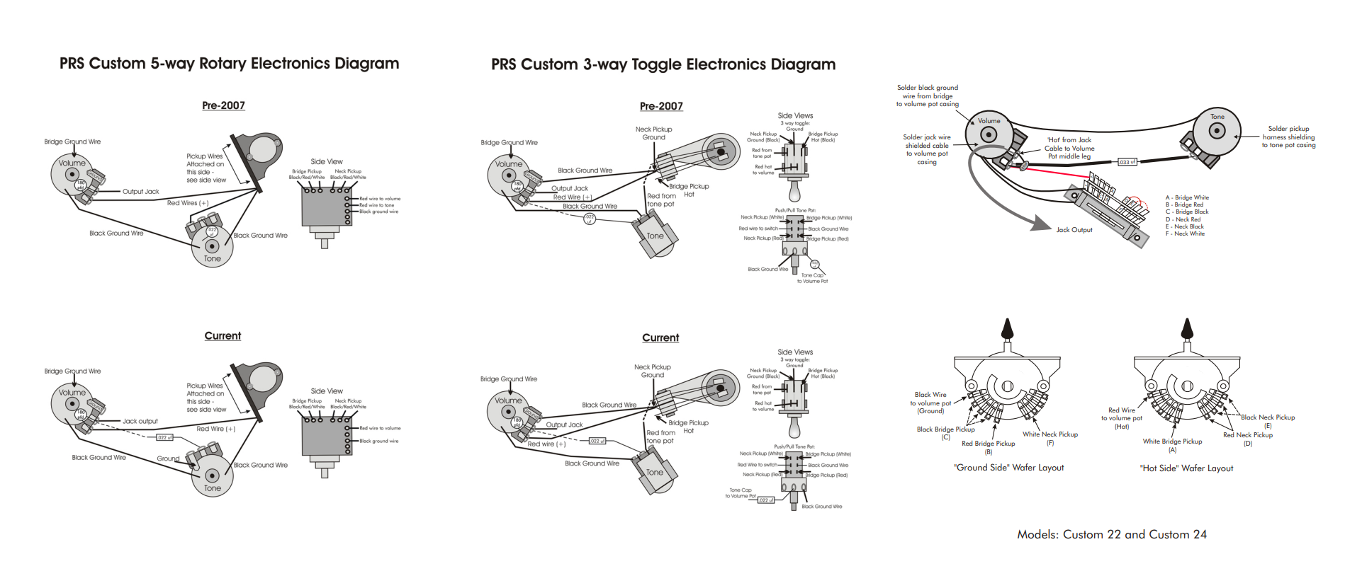 PRS 스펙의 변화를 큰 축으로 나누자면, 우선 컨트롤부의 변화를 기준으로 나눌 수 있을 것 같습니다. 극초기에는 3단 토글에 푸시/풀 톤 노브로 sweet switch를 조절했다고 합니다. 이후 오랫동안 PRS의 상징과도 같았던 5단 로터리가 도입됩니다. 동그란 노브가 3개 달려있는데, 각각 볼륨, 톤, 픽업 설렉터 입니다. 이 중 픽업 설렉터 노브를 돌리면, 두 험버커 픽업의 바깥쪽을 직렬로 연결하거나 해서 펜더스러운 하프톤을 낼 수 있도록 한 시스템이었다고 합니다. ‘이 하프톤이야말로 진정한 PRS 다운 소리’라고 주장하는 분들도 꽤 계십니다만, 이 로터리 설렉터는 라이브 중에 픽업 포지션을 바꾸는 게 거의 불가능할 정도로 어렵다는 단점이 있어서 많은 사람들이 특유의 하프톤을 포기하고 3단 토글 + 푸시/풀 톤으로 개조하고는 했습니다. PRS도 대세를 받아들이고 1998년부터 이걸 옵션 (Custom 24에서는 옵션이지만, 아예 3단 토글을 기본 사양으로 하는 기타도 있었습니다)사항으로 넣었습니다. 2011년 이후로는 5단 블레이드 스위치를 기본으로 도입하였고, 이것이 몇 번의 개조를 거치며 현재에 이르고 있습니다. 2018년 현재 기준, 일반적인 방법으로 주문할 때 Custom 24의 경우 5단 로터리나 3단 토글 옵션을 선택할 수 없습니다.