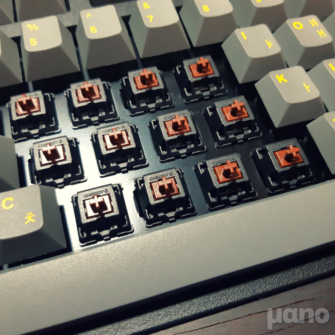 한국에서 갈축은 주로 넌클릭(non-click)으로 불리는데, 이 명칭 때문인지 클릭에서 소리를 제외한 느낌일 거라는 막연한 생각을 하게 되는 것 같습니다. 레오폴드 갈축, 흑축, 청축을 주로 사용해보면서 받은 개인적인 느낌은, 체리 갈축은 청축에서 소리를 제외했다기보다는 리니어 스위치에 걸림을 추가한 것 같은 인상을 준다는 겁니다. 제가 키보드 관련해서는 경험치가 별로 없어서 그냥 이렇게 느꼈습니다만, 조금만 알아봐도 체리 갈축에서 부족한 키압과 걸림을 보충하기 위해 특주축 스위치를 사용하거나 개조하거나 하는 사례가 아주 많더군요.