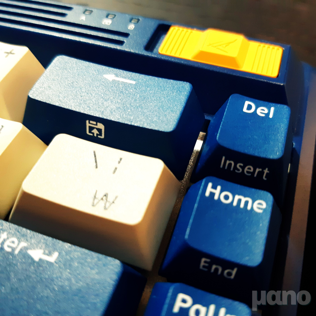 68키 미니키보드인데, 자판에는 빈 공간 없이 키가 꽉 들어차 있습니다. 개인적으로는 아주 마음에 드는 디자인입니다. 특히 방해만 되는 Insert 키를 Fn + Delete 조합으로 사용하도록 설계한 건 아주 마음에 드네요. Delete 키가 백스페이스 키 옆 제일 구석에 붙어있는 점도 직관적이고요. 다만 F열이 없어서 Fn + 숫자키의 조합으로 활용해야 하는데, 이 점이 좀 아쉽습니다. 상단 베젤이 F열 영역 정도를 차지하고 있는데 그냥 없애버리고 F열이 들어갔으면 어땠을까 하는...
