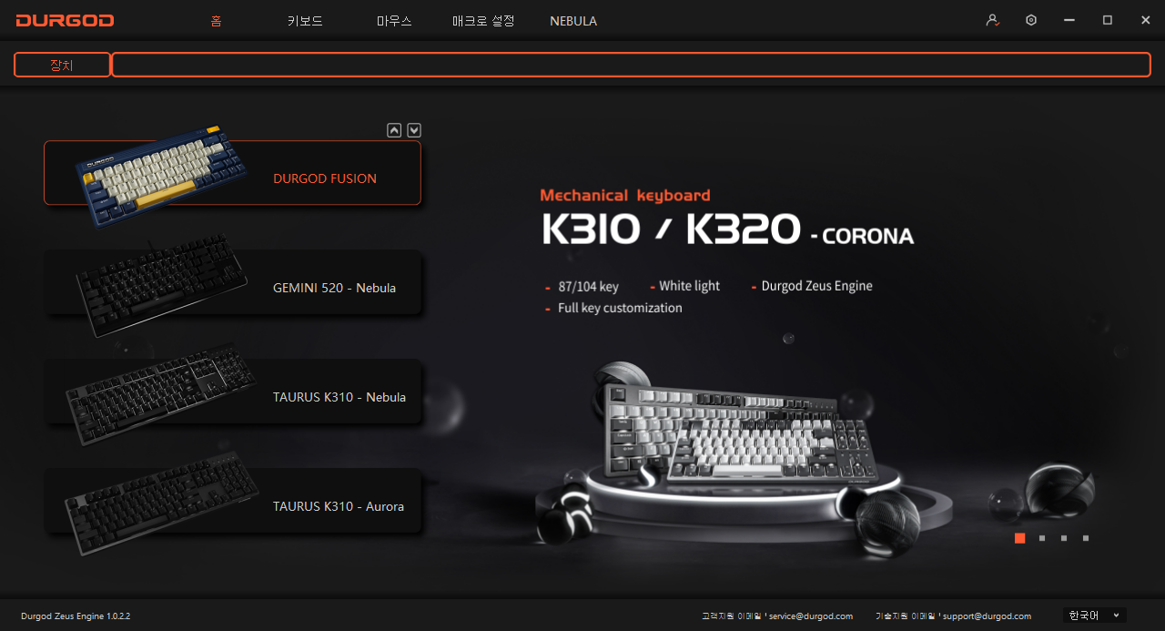 다만 한 가지 유의해야 할 점이, 기기 전환할 때 Fn + 특정 키를 아주 빠르게 누르고 떼야 합니다. 특히 Fn + E 키로 이루어지는 2.4GHz 유선 연결은 특히 주의해야 합니다. 처음에 사용법을 잘 모를 때 Fn + E키를 꾹 누르고 있었는데, 상단 인디케이터가 깜빡깜빡 점멸하고, 듀가드에서 제공한 제우스 엔진을 설치했는데도 입력이 안 되더군요. 알고 보니 Fn + E를 길게 (2초 이상) 누르고 있으면 수동 페어링 모드로 전환되는데, 이 경우 다시 자동 페어링 모드로 전환을 해 줘야 합니다. 공식 수입처 홈페이지와 카페에서 관련 프로그램과 사용법을 내려받을 수 있는데... 저도 기계 사용하는 방법 잘 모를 때 딱 한 번 말고는 사용한 적이 없는 기능입니다. 그러니 이 글에서 자세하게 설명하지는 않겠습니다. 중요한 내용만 요약하자면, 'Fn + E키를 2초 이상 꾹 누르고 있으면 안 됩니다.'
