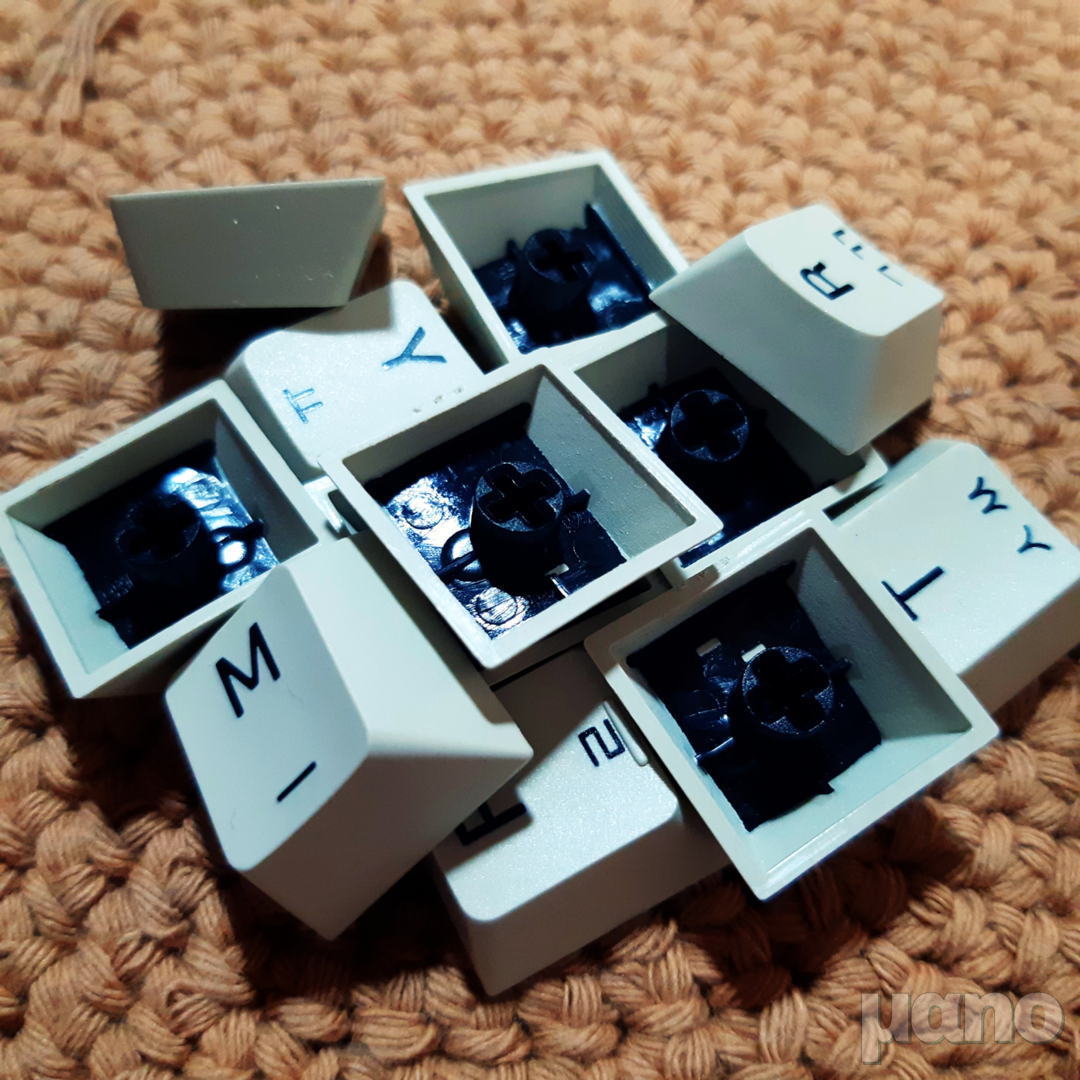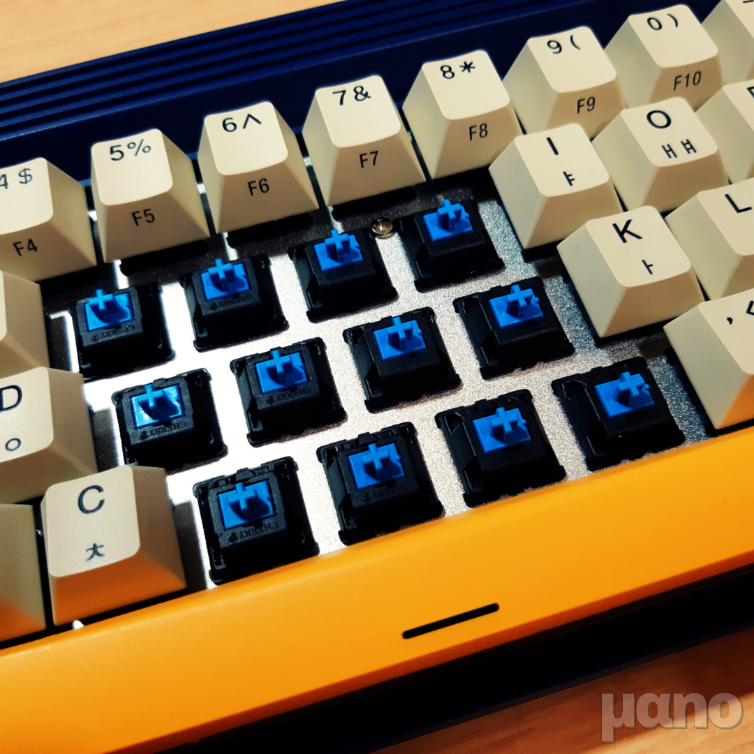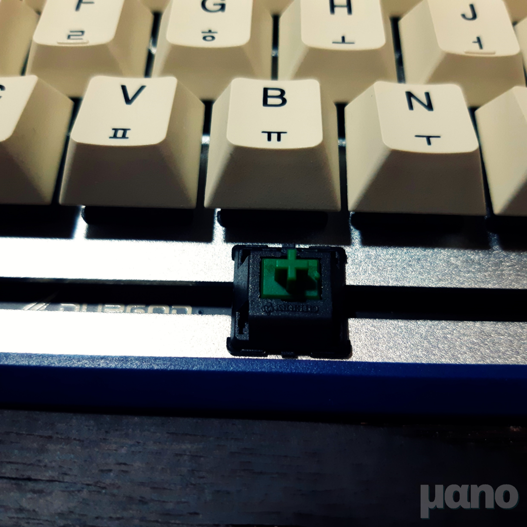 아, 그리고 재미있게도 스페이스바에는 체리 녹축이 적용되어 있습니다. 청축보다 더 강한 반발력을 가진 스위치입니다. 힘이 많이 들어가는 스페이스바에 좀 더 강한 반발력을 가진 스위치를 사용한 것 같은데, 다른 스위치가 적용된 제품들에서도 이런 설계가 되어있는지는 모르겠네요. (예를 들어 갈축 스페이스바는 클리어축이라거나, 적축 스페이스바는 흑축이라거나...)