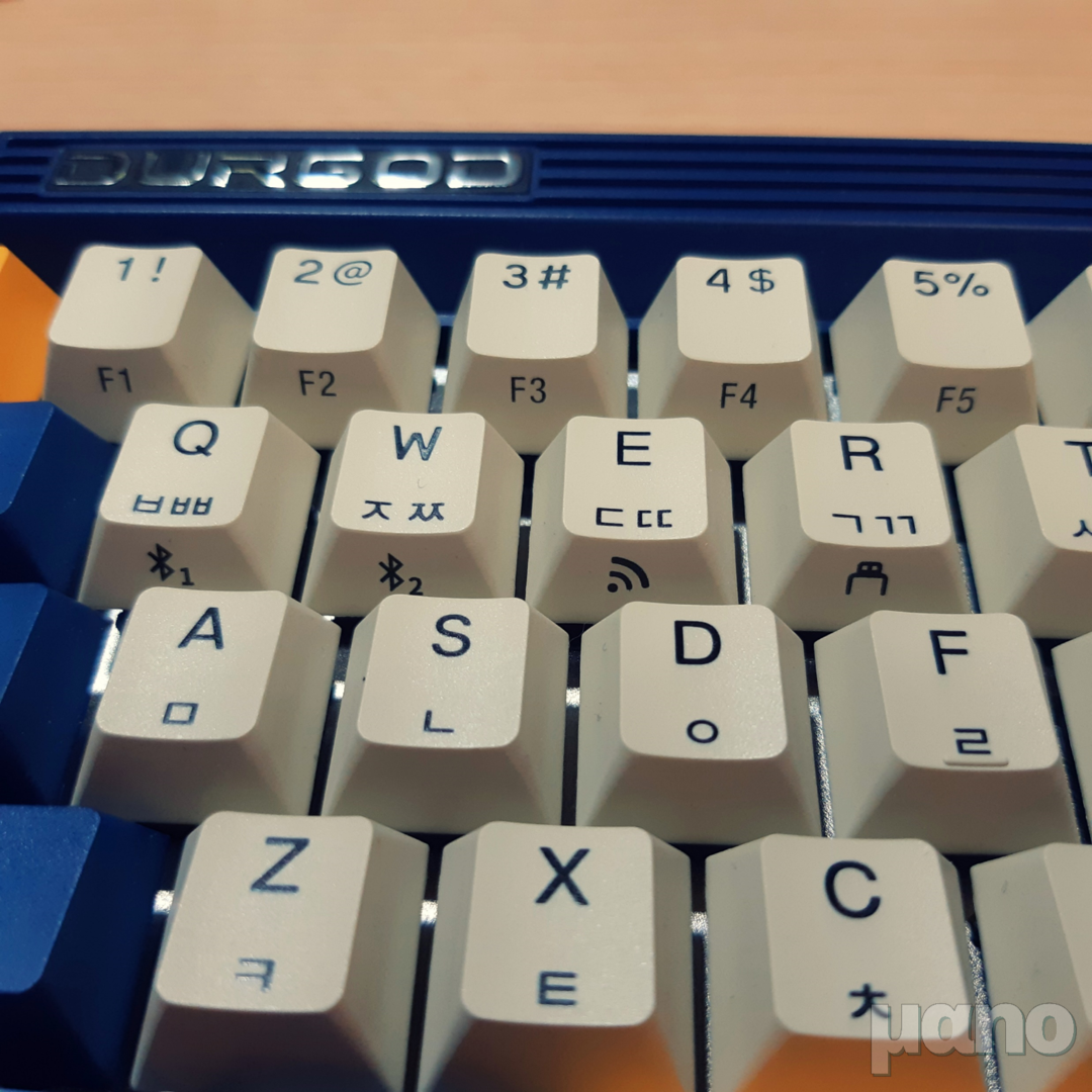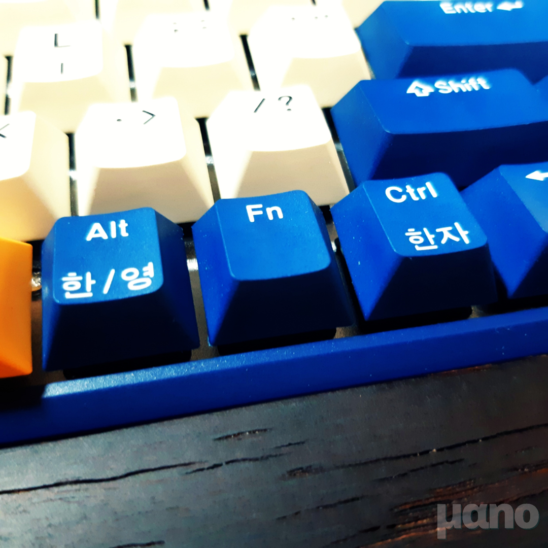 우선 PBT 이중사출 키캡이 적용되었습니다. 특히 새로운 국내 공식 수입처에서 마케팅 포인트로 삼고 있는 지점으로, 올드한 느낌의 한글 각인도 되어 있습니다. 이 부분에 관해서는 호불호가 갈릴 수 있겠습니다만, 저는 굉장히 마음에 들었습니다. 굴림체만 아니면 되죠.