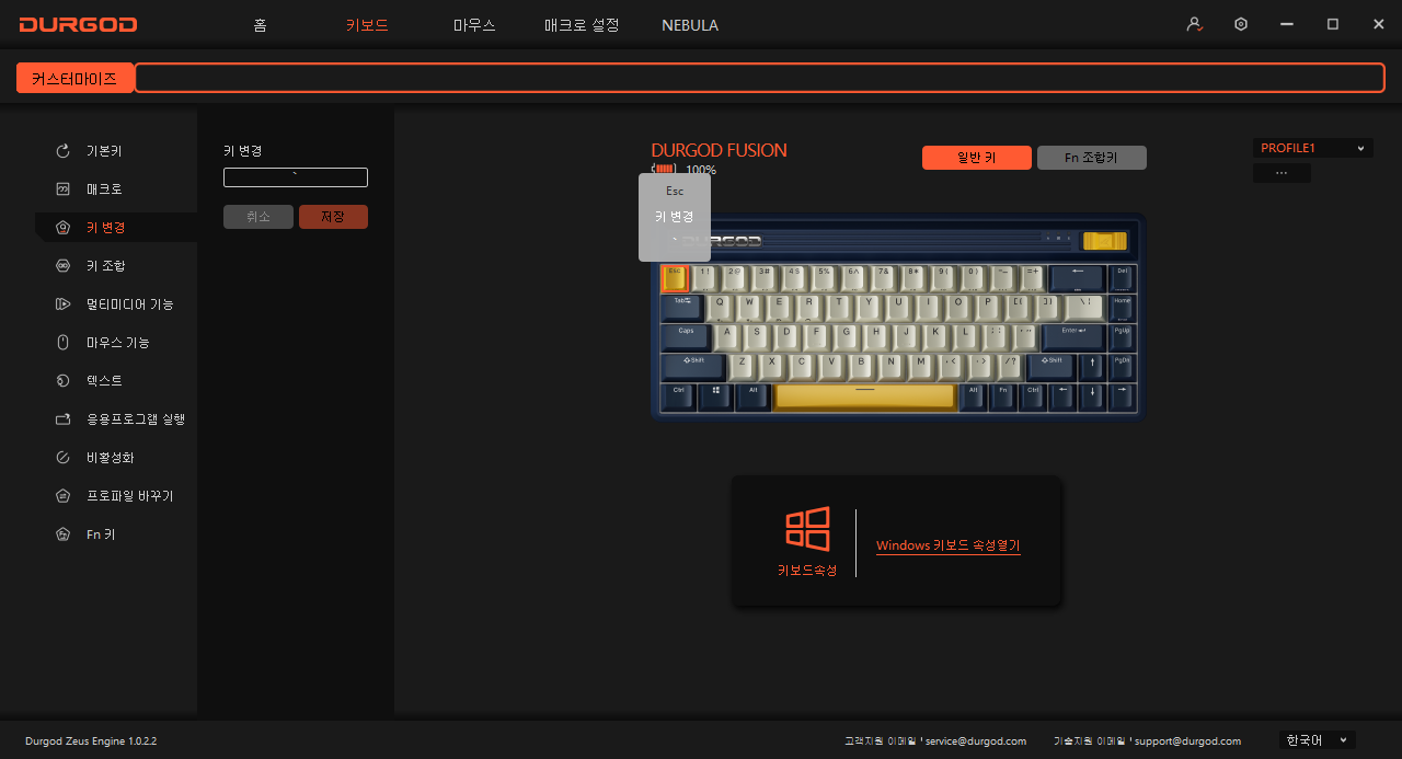 그래서 저는 '키 변경' 기능을 활용해 Esc를 `로 변경하고, Fn + Esc 조합키를 `에서 Esc로 변환했습니다. 이렇게 되면 일반적인 키보드를 활용할 때처럼 Shift + `키로 ~를 편리하게 입력할 수 있습니다.