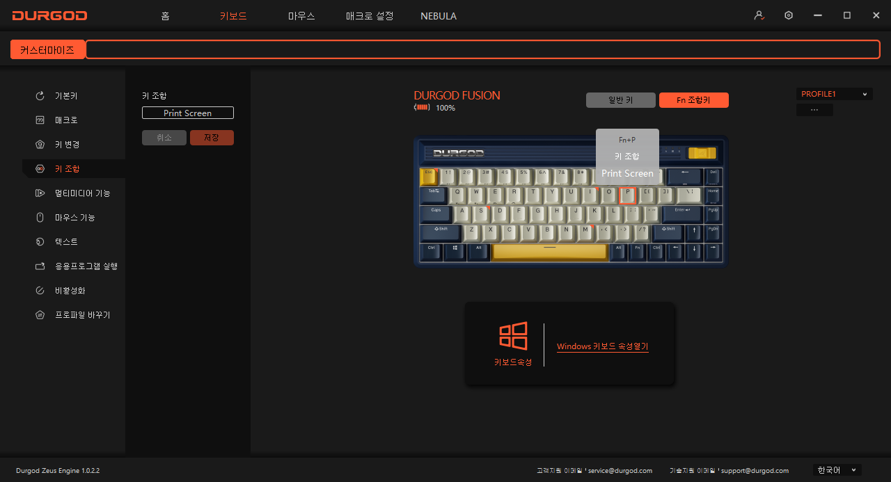 Fn 조합키에서 P를 선택하고 '키 조합' 기능을 활용해 Print Screen 키를 할당했습니다.