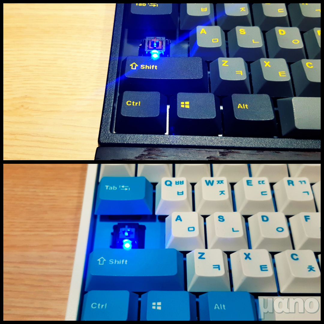 비교 대상은 레오폴드 FC900R PD 애쉬 옐로우 갈축입니다. 위는 꺼진 상태, 아래는 켜진 상태인데, 차이가 잘 드러나지 않습니다. 주변 조명이 밝다거나, 타자할 때 사선 아래로 내려다보는 각도면 시연성은 더욱 떨어집니다.