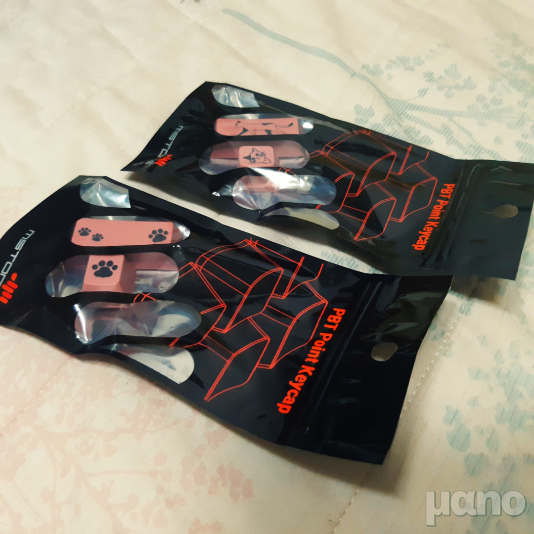 그래서 '포인트 키캡'으로 검색해서... 분홍색... 핑크... 하다가 저 엠스톤 포인트 키캡을 발견하게 되었습니다. 저 위의 하츠네 미쿠 키보드 감성을 살리려면 쨍한 마젠타 색 키캡을 구했어야 하겠지만... 저 냥이 & 냥이발 키캡을 발견하고서는 홀린 듯이 구매해버리고 말았습니다.
