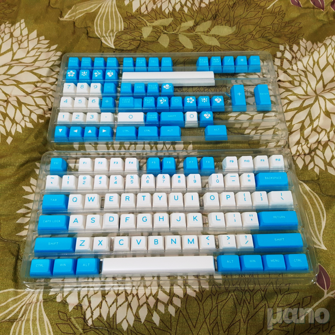 해외 직구로 구매했습니다. 별 특징 없는 상자에 담긴 상태로 도착했고, 투명 플라스틱 재질의 트레이에 130개의 키캡이 나누어져 담겨 있습니다. 이런 키캡 보관용 트레이는 처음 가져 보는데, 상당히 마음에 듭니다. 표준 ANSI 배열의 104키 키보드에도 포함되고, 체리 키 같은 특수 키캡도 들어 있습니다. 어지간한 키보드는 키캡 놀이가 가능할 것 같습니다. 104키 풀배열 키보드 말고는 잘 사용하지 않아서 아무래도 상관 없지만요.