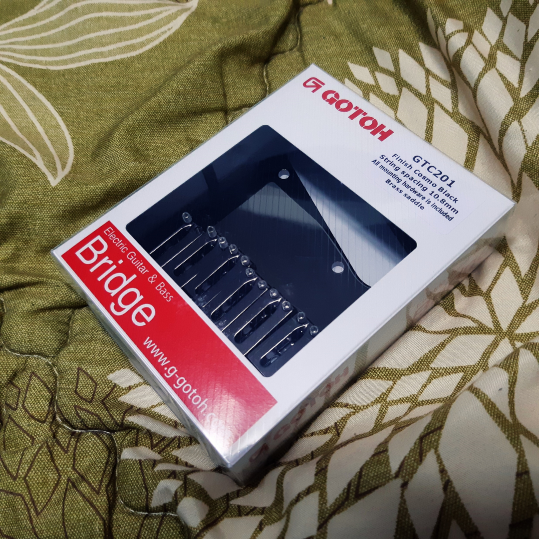 긴 설명이 필요 없는 신뢰의 고또 브릿지입니다. 펜더에서 생산되는 텔레캐스터용 6새들 브릿지가 있긴 했는데, 일펜 장착 부품과도 호환이 가능했으나 설명에 '멕시코 펜더용'으로 되어있어서 뭔가 피하게 되더군요. 국내에서 구하기가 힘든 것 같아 해외 직구로 주문했는데... '코스모 블랙 색상으로 교체한 헤드머신하고 맞출까?' 생각도 했었지만 프론트 픽업·컨트롤 플레이트와의 조화도 고려해서 크롬 색상으로 주문했었는데, 대략 만 원 더 비싼 코스모 블랙 색상 브릿지가 잘못 도착했습니다(...) 우여곡절 끝에 그냥 쓰는 걸로 결정. 원래 더 비싼 옵션이기도 하고 의도치 않은 깔맞춤이 되어서 결과적으론 잘 되었다고 생각합니다.