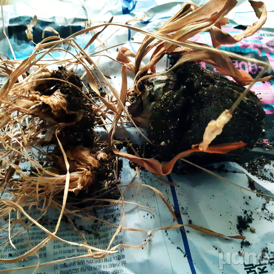 캐낸 구근은 양파망 같은 데 넣어서 서늘하고 건조하고 바람 잘 통하는 곳에서 보관하면 됩니다. 대충 가을까지는 이렇게 두었다가 저온 처리를 하면 됩니다.