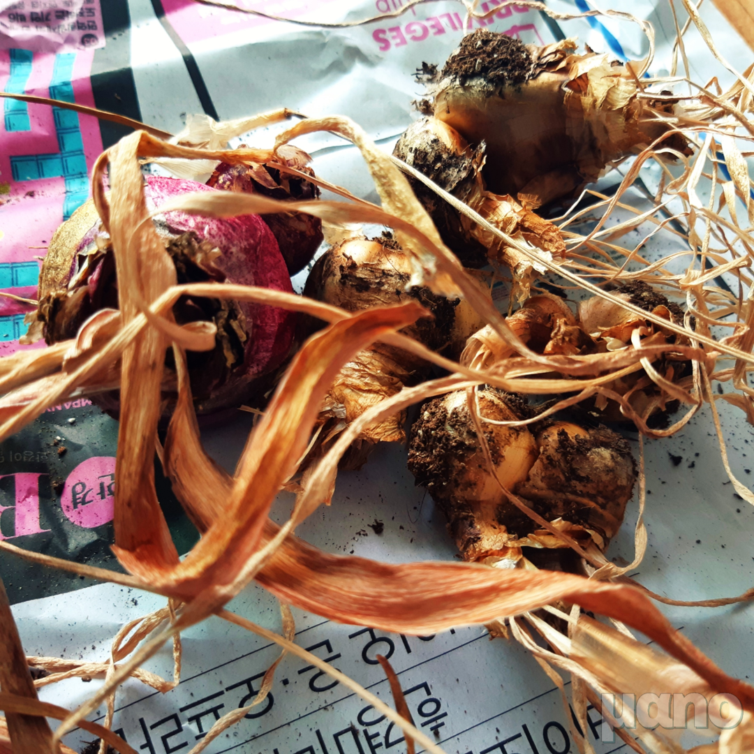 캐낸 구근은 양파망 같은 데 넣어서 서늘하고 건조하고 바람 잘 통하는 곳에서 보관하면 됩니다. 대충 가을까지는 이렇게 두었다가 저온 처리를 하면 됩니다.