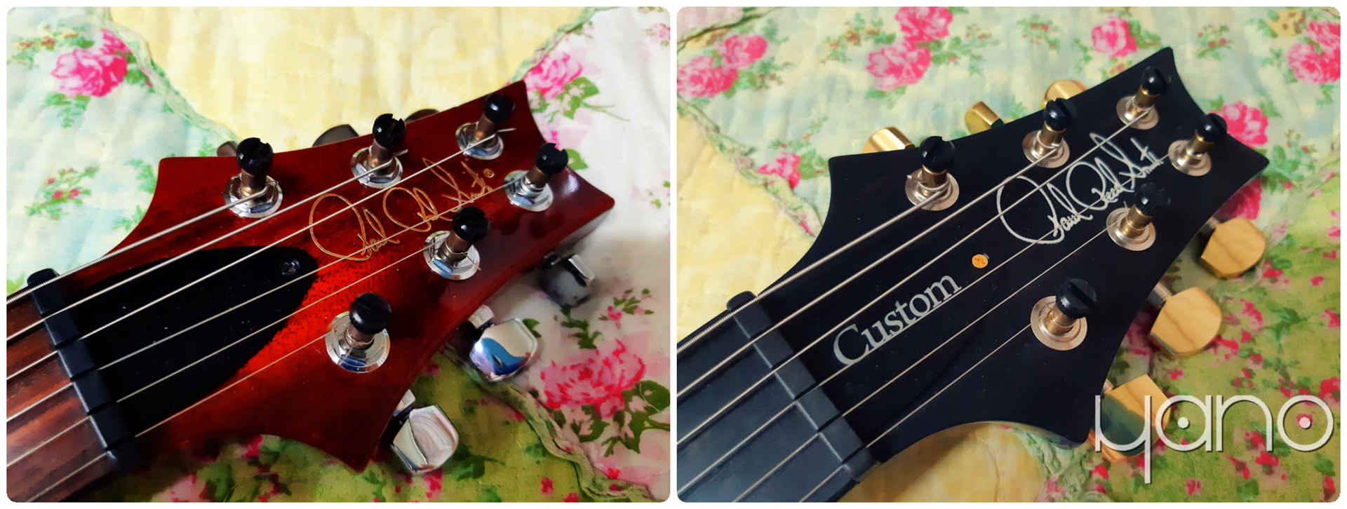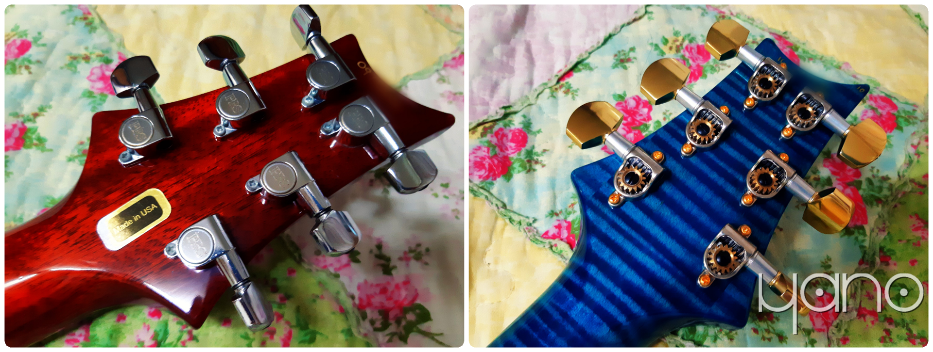 헤드머신은 3번의 변화를 겪었는데, 우선 초기의 날개 달린 락킹 헤드머신(직접 사용해 본 적은 없습니다만, 편의성 면에서는 만점이라고 평가받지만 의외로 싫어하는 사람이 많다는 느낌입니다), 이후 헤드 앞쪽에서 동그란 나사를 조이는 방식의 락킹 튜너를 쓰고 있습니다. PhaseⅠⅡⅢ로 구분하면 될 것 같습니다.(실제로 PhaseⅠ이라는 이름이 사용된 적은 없습니다.)이건 최근 모델에는 최근 헤드머신을 달고 나오는 식이라 선택권이 없습니다. 기존에 쓰던 2009년식 Custom24 '주황이(왼쪽)'에는 PhaseⅡ가 장착되어있고, 2012년 이후 PhaseⅢ가 기본 장착됩니다. 디자인 면에서는 뒤쪽이 뚫려서 나사가 노출되는 모습이 더 빈티지하고 멋있어 보입니다. 최근 Experience PRS in Japan 행사에서 Modern Eagle을 완벽 복각한 기타를 몇 대 선보였는데, 거기에 구형 헤드머신이 장착된 것을 봤을 때, 만약 당신이 감당할 수만 있다면 구형 헤드머신도 장착할 수 있을 겁니다. 저는 락킹 헤드머신의 편의성을 좋아하고, 폴 리드 스미스 씨가 심심해서 헤드머신을 바꿔끼진 않았을 거라 생각하는 쪽이고, 그래서 제일 최신형의PhaseⅢ를 선택하겠습니다.