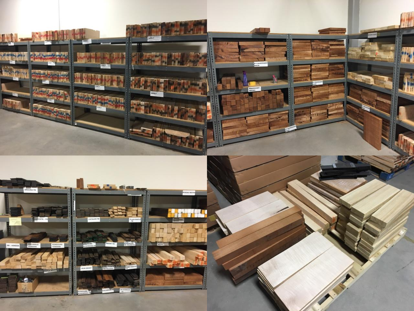 우선 바디 목재의 경우 마호가니, 코리나, 애쉬 정도가 흔하게 볼 수 있는 우드 라이브러리 옵션입니다. 가끔 엘더 바디 PRS 기타가 보이기도 하는데, 우드 라이브러리에서 선택한 걸 본 적은 없습니다. 프라이빗 스톡에서는 통 로즈우드 바디라던지, 어떻게 이런 무늬가 생겼지 싶은 마호가니나 애쉬라든지, 블랙 림바나 핑크 아이보리 같은 특수 목재들도 보입니다만, 우드 라이브러리에서 선택할 수 있는 것 같지는 않습니다. 코리나(4개 사진 중 우측 위 사진의 코너에서 오른쪽 벽면 수납장의 위쪽 세 칸을 차지한 밝은 색 목재, 우측 아래 사진의 오른쪽 끝에 세 묶음으로 쌓여있는 약간 녹색기가 도는 목재)의 경우, 우드 라이브러리는 3피스로만 제작이 가능한 걸로 보입니다. 코리나(화이트 림바)라는 목재가 워낙 수분과 당분이 많아 해충과 균류의 피해를 많이 받는 데다 건조가 까다로워 큰 나무를 벌목해도 정작 사용할 수 있는 부분은 적다는 단점 때문에 마호가니보다 중고음역대가 또렷하다는 장점이 있는데도 잘 사용되지 않는다는데, 그런 이유 때문인 것으로 추측됩니다.