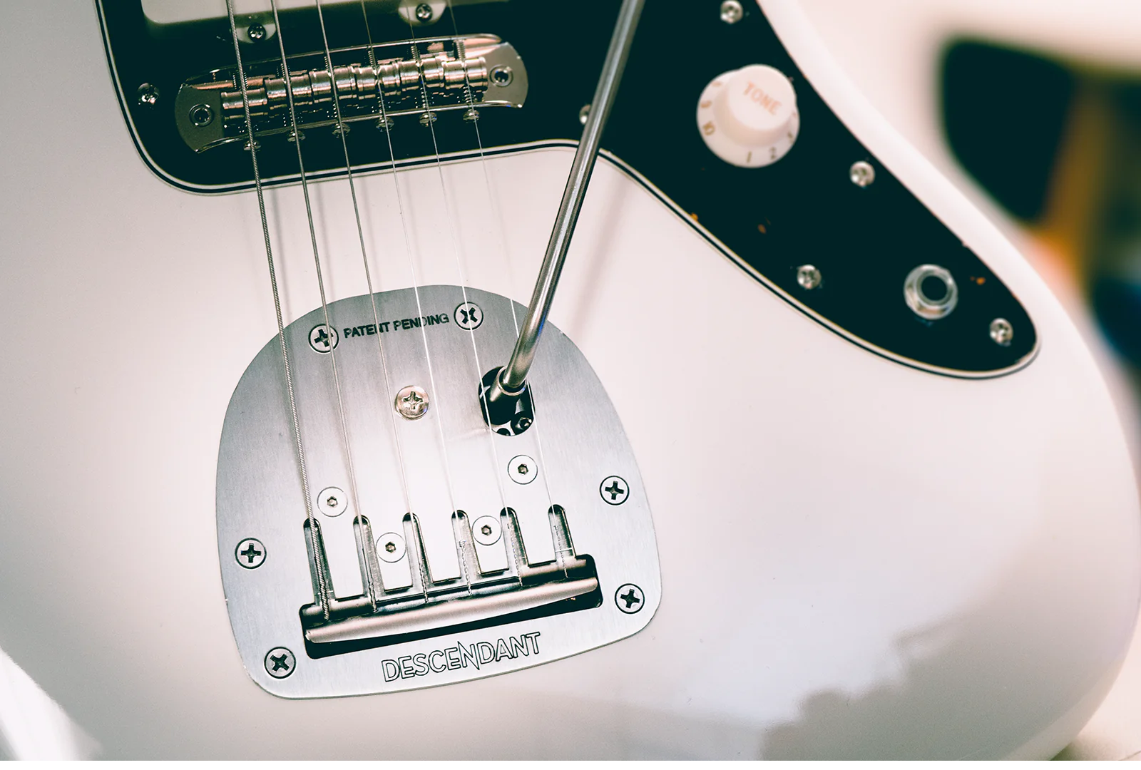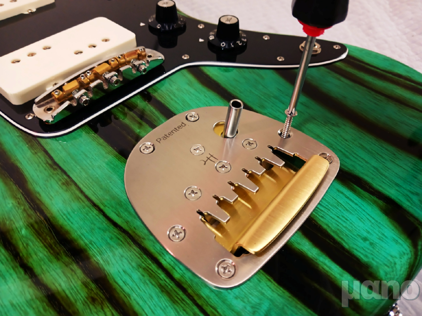플레이트에 ‘상어 이빨’처럼 생긴 부분이 있는데, Descendant Vibrato처럼 스트링에 각도를 줘서 오프셋 바디 특유의 부족한 장력 문제를 보완하려는 설계이기도 합니다만, 저 ‘상어 이빨’에 스트링을 장착하면 고정형 브릿지로 사용이 가능하다고 합니다.