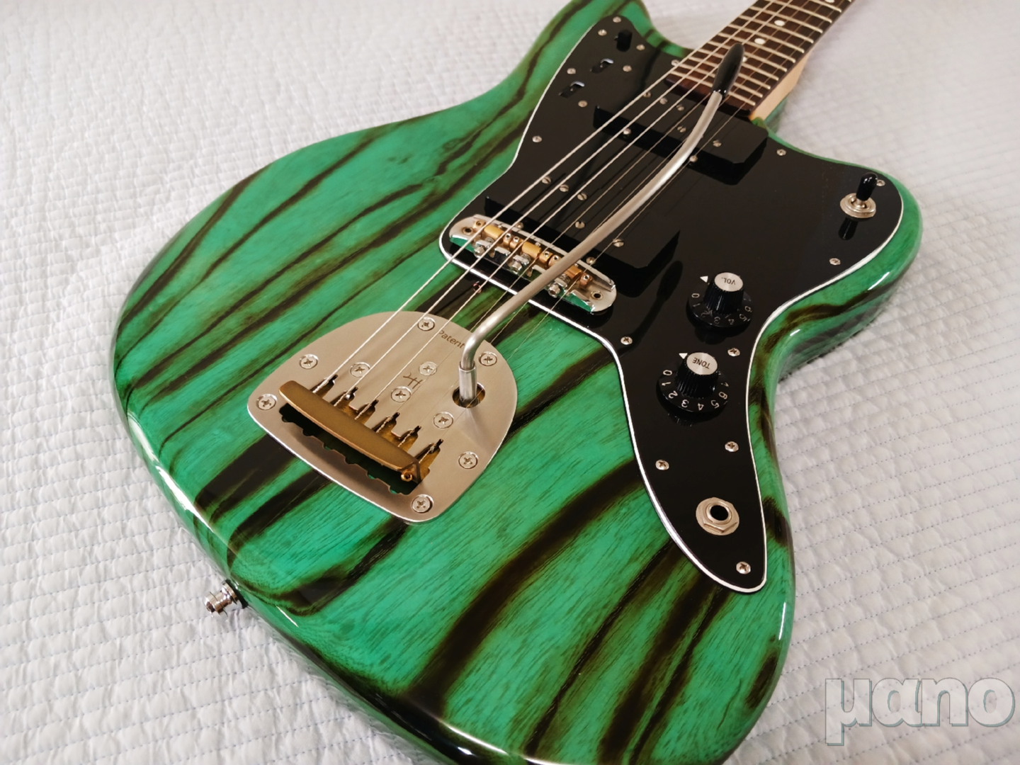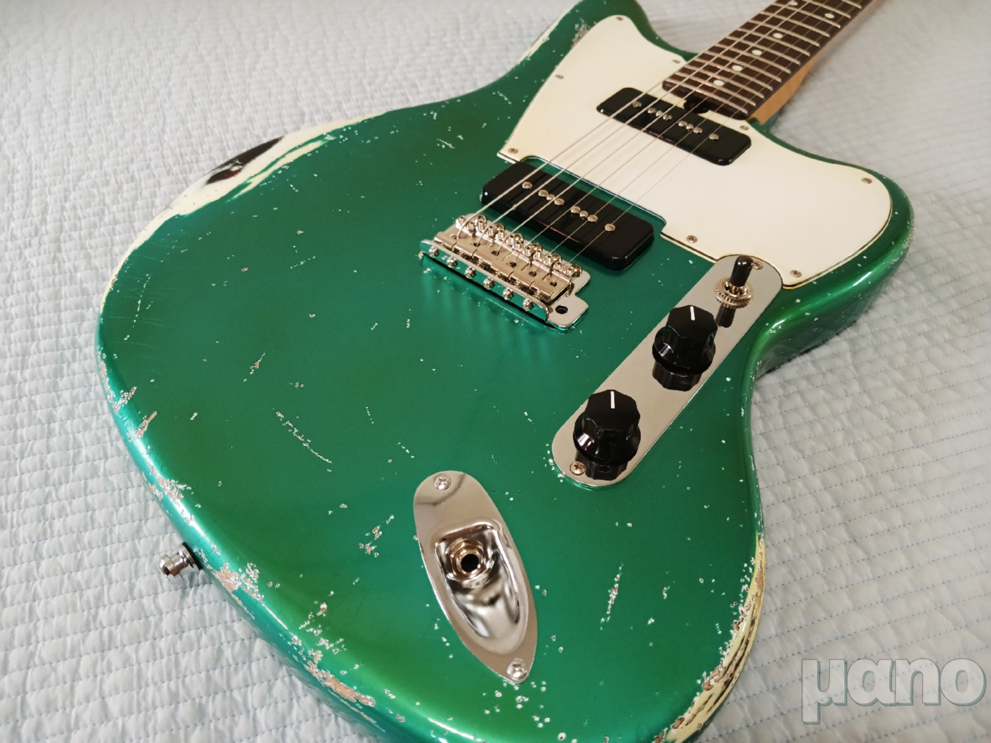 아웃풋 잭을 제외하고 전기가 흐르는 모든 부품을 교체한 초록이입니다. 튀어나온 쪽 어깨에 1962년식 재규어 간격으로 리듬 서킷을 장착하느라 바디 목재도 일부 파냈습니다. 순정 상태에서는 1960년대 텔레캐스터 같은 느낌이었는데, 지금은 뭐라 설명하기 힘든 아주 독특하고 개성 강한 악기가 되었습니다. 요즘은 오히려 파랑이보다 초록이가 더 메인 기타로 활약하고 있지 않나 하는 생각도 듭니다.