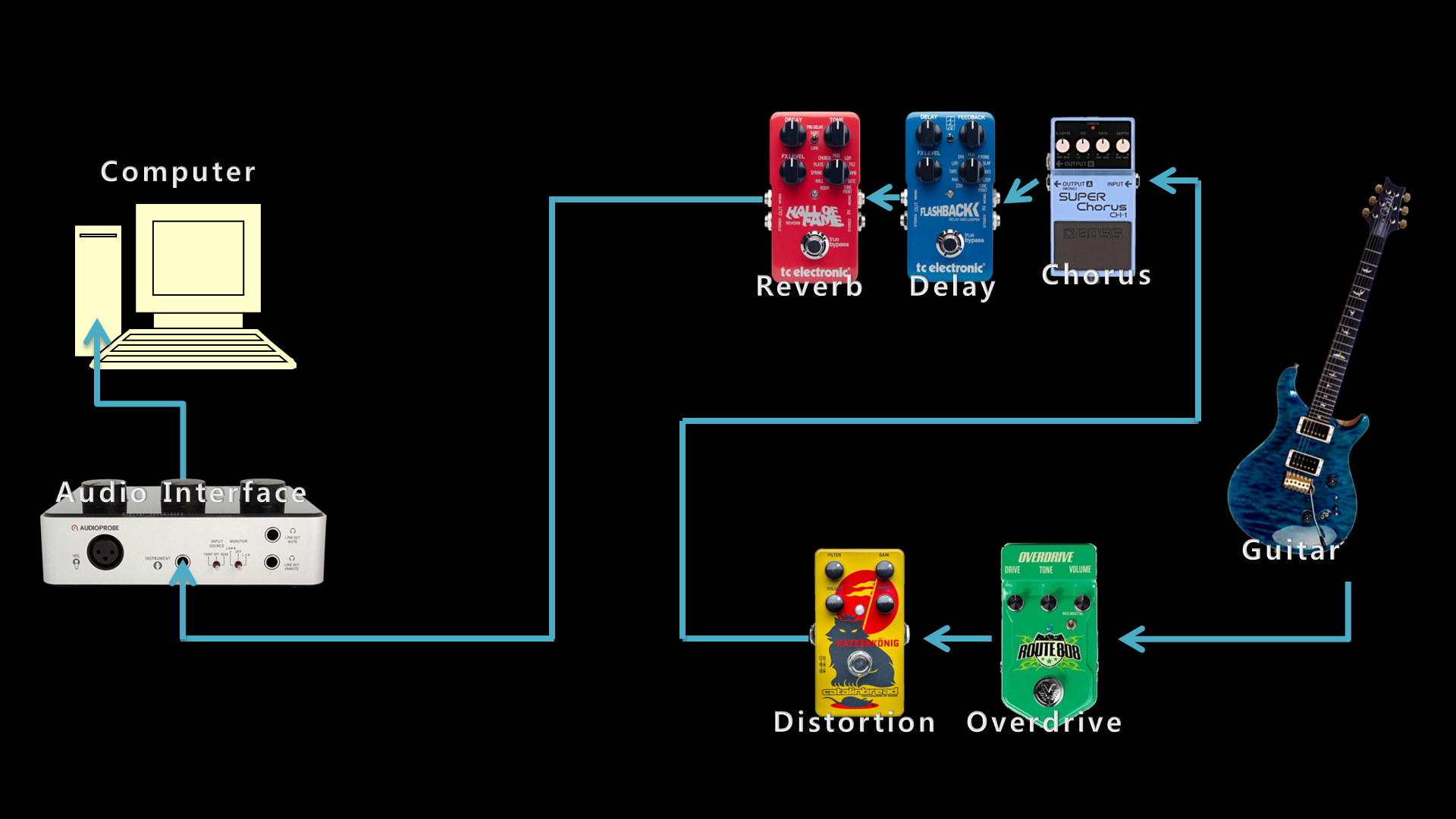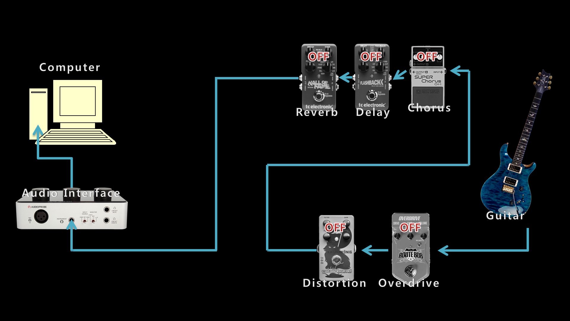 이 글의 예상 독자는 ① 멀티 이펙터가 아닌 페달형 이펙터들을 하나 둘 모아서 만든 페달보드를 가지고 있으며, ② 밖에 나가면 앰프를 이용해 합주도 하고 공연도 하지만, 집에서 앰프를 이용한 하드 레코딩은 현실적으로 어려운 상황이라서, ③ 컴퓨터로 녹음을 하고자 하는 홈 레코딩 입문자라고 가정했습니다. 페달보드가 많이 단출한 느낌입니다만, 가장 기본적인 이펙터들을 가지고 예시를 들어주는 정도로는 부족함이 없다고 생각합니다. 여기에 컴프레서나 EQ 정도가 추가된다면 레코딩 할 때 직관적으로 다룰 수 있는 변수가 조금 더 늘어날 수 있을 것이라 생각합니다만, 개인적으로는 믹싱할 때 다른 트랙들과의 조화를 고려하면서 DAW 내장 이펙터로 조정하는 편입니다. 트레몰로, 플렌저, 와우 같은 다른 이펙터들도 취향 따라 더 얹어질 수는 있겠지만, 아마 이펙터를 필요한 순서대로 하나 둘 모은다면 가장 기본적으로는 오버드라이브 → 디스토션 → 코러스(모듈레이션) → 딜레이 정도가 되지 않을까 합니다. 보통 페달보드를 들고 다니며 앰프를 사용하는 상황이라면 리버브는 앰프에 내장된 것을 쓰는 경우가 많겠지만, 앰프를 활용하기 어려운 상황을 가정했고, 제가 빈티지한 에코 느낌의 리버브를 좋아해서 추가했습니다.