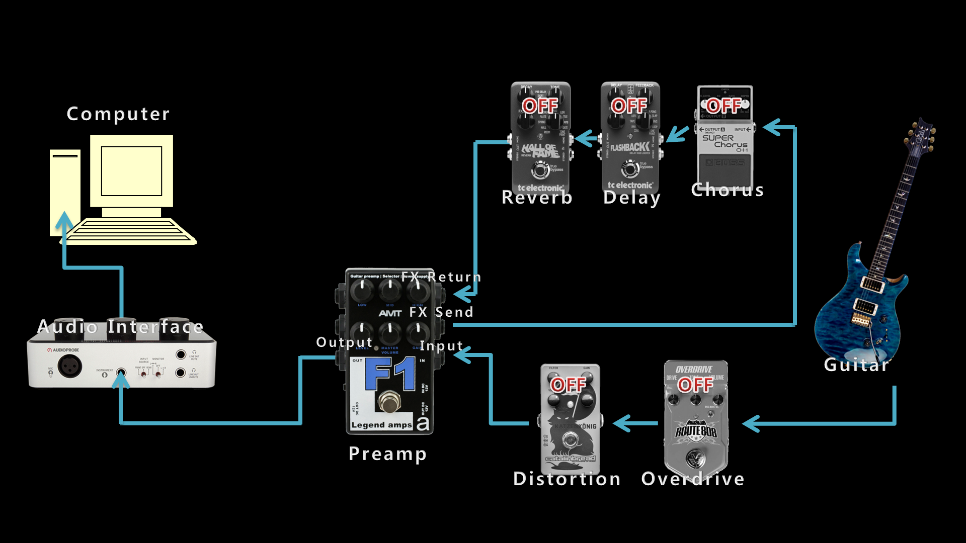 페달형 프리앰프도 많은 제품이 출시되어 있습니다만, 일단 경제적 여력을 고려해 상한선을 정한 다음, 펜더 클린 톤이 취향이라는 정도의 이유로 후보가 꽤 압축되었고, 그중에서도 제일 유튜브 리뷰가 많은 데다 직관적으로 보이는 AMT 사의 F1을 최종적으로 선택했습니다.