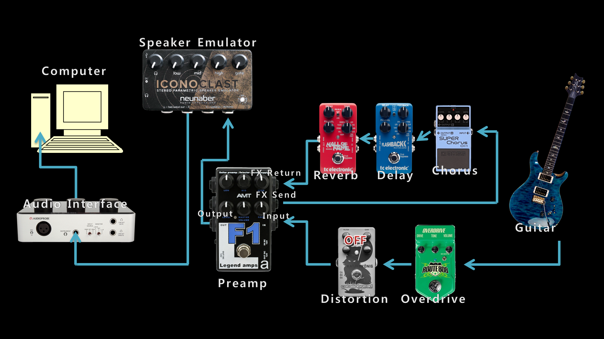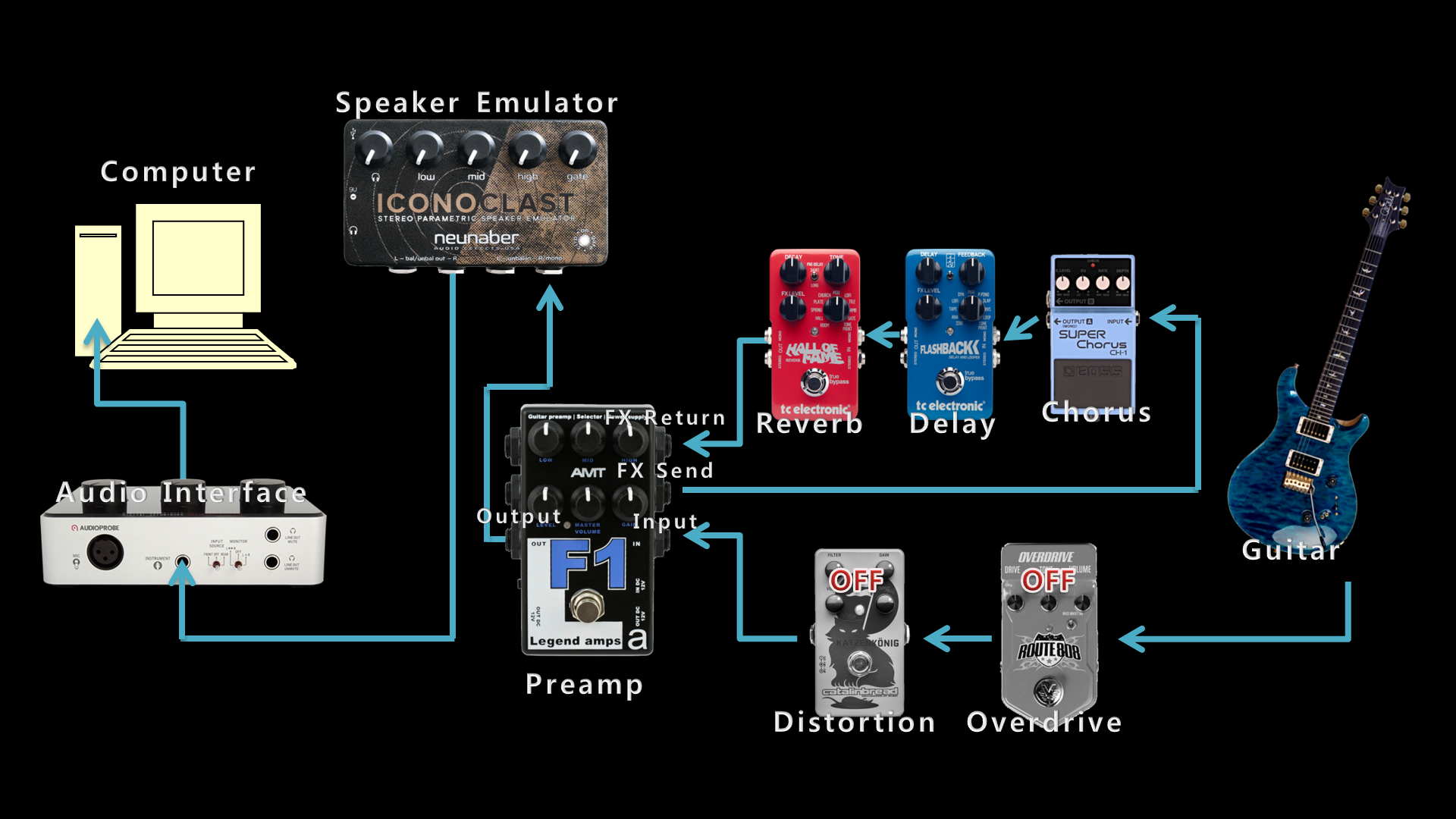 자, 이렇게 저의 지난 4년 동안의 '페달보드로 일렉트릭 기타 레코딩하기' 중간 정리가 끝났습니다. 음, 어찌 보면 '하기'보다는 '해보려고 헤매기'에 더 가까운 것 같습니다. 사실 그 4년 중 3년은 별다른 변화 없이 보낸 기간이었고, 지난 1년 동안에 장비 두 개가 추가되면서 꽤 극적으로 변했다고 보는 편이 옳을 것 같습니다.