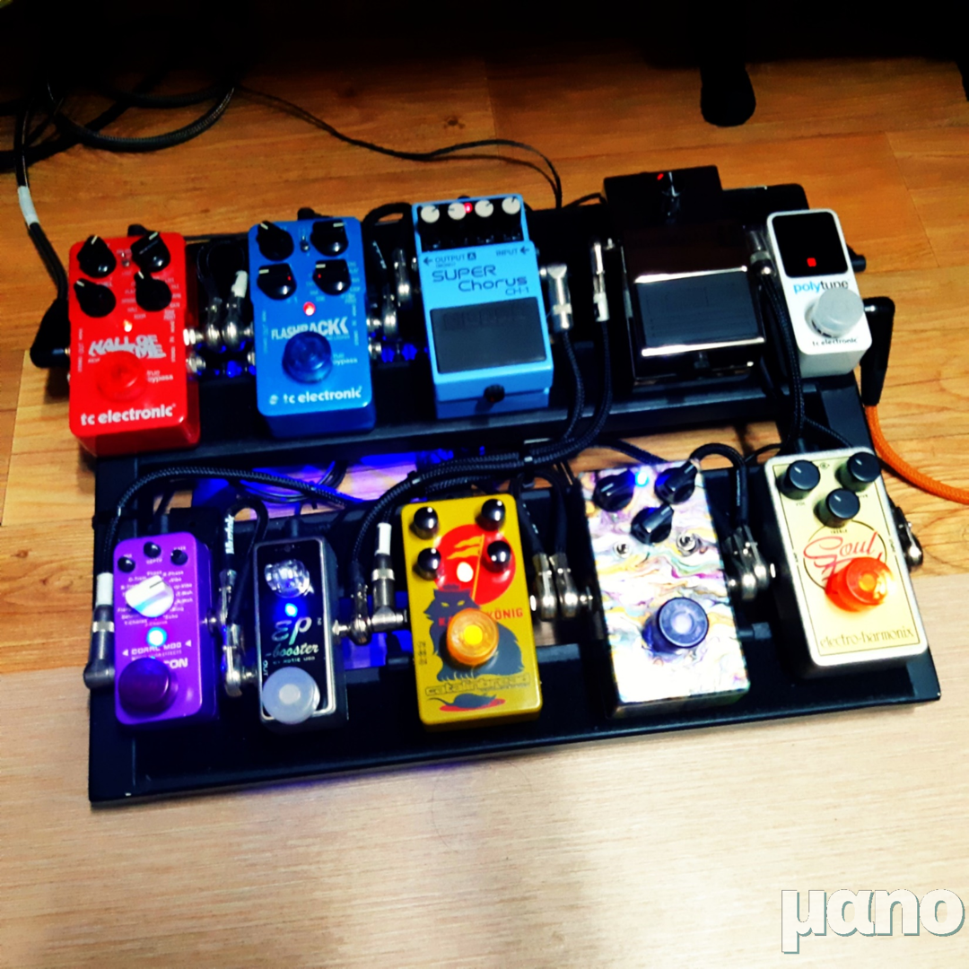페달보드에 장착했습니다. 회로는 기타 → 튜너 → 드라이브 → 클린 부스터 → 노이즈 게이트 → 공간계 → 앰프 순서입니다. 기존에 있었던 ehx의 Mono Synth가 빠졌습니다.